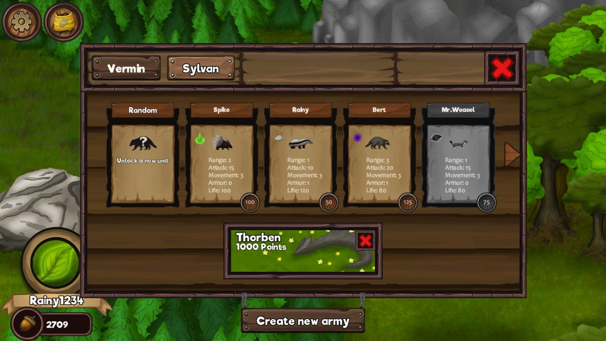 Chaque race possède plusieurs unités. Chacune de ces unités a ses propres caractéristiques que ce soit en point de vie, en attaque, en défense, en rapidité et même certains ont des attaques spéciales (comme l’écureuil qui peut soigner une unité une fois tous les trois tours).