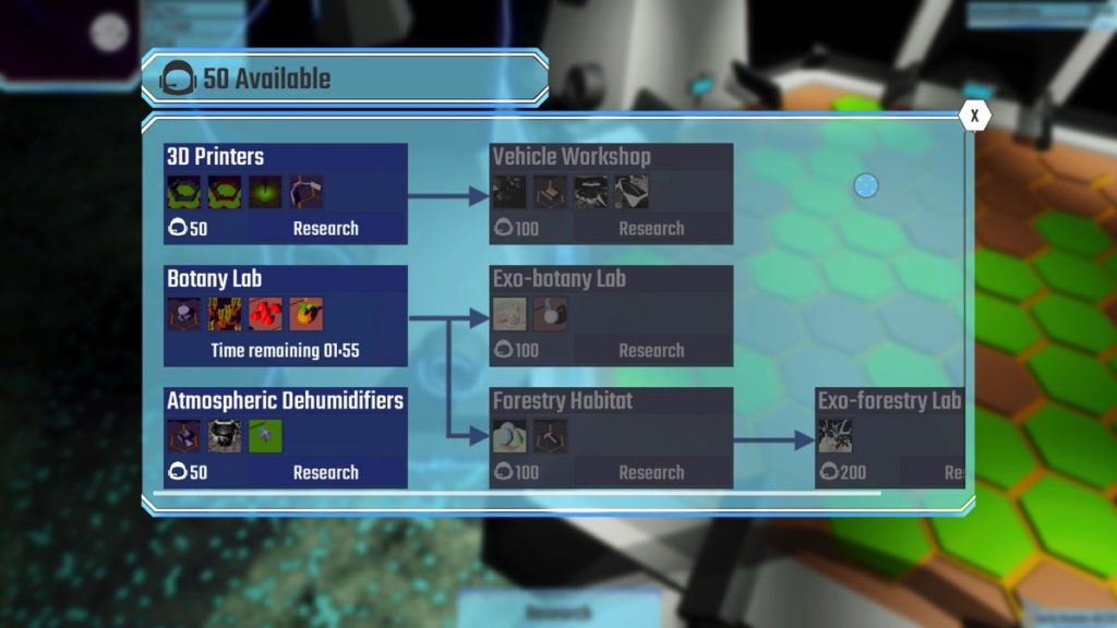 Vous avez devant vous un enclos sous un dome avec un ordinateur sur le côté. Un véhicule se trouve au milieu de l’enclos et il est votre représentation sur la planète. Autour de ce dome se trouve six points de construction. Vous choisissez les bâtiments que vous désirez en accédant à l’ordinateur. Sachez que certains des bâtiments sont absolument nécessaires (à vrai dire, je me demande si ce n’est pas le cas pour tous !) comme le centre de recherche pour avoir de nouvelles technologies ou l’imprimante 3d pour construire tout ce que vous pouvez avoir besoin.