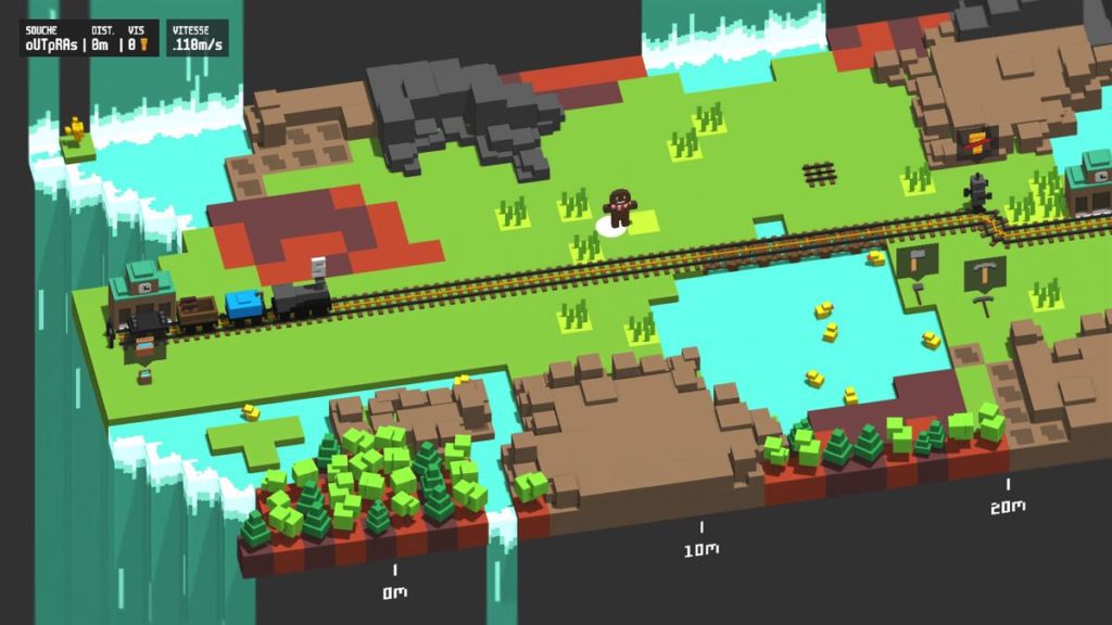 – que vous n’avez pas de rails d’avance, vous devez donc couper du bois, piocher de la pierre et amener l’ensemble dans un wagon spécial qui vous fabriquera des rails. Ensuite, il faudra les positionner sur le sol devant la locomotive jusqu’à rejoindre la prochaine gare !