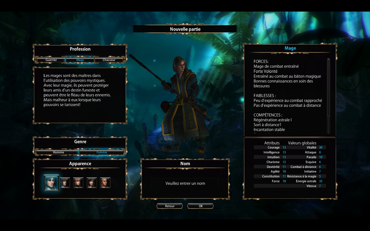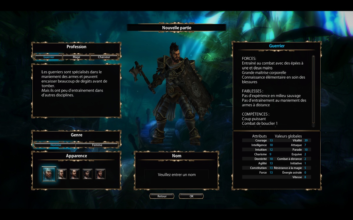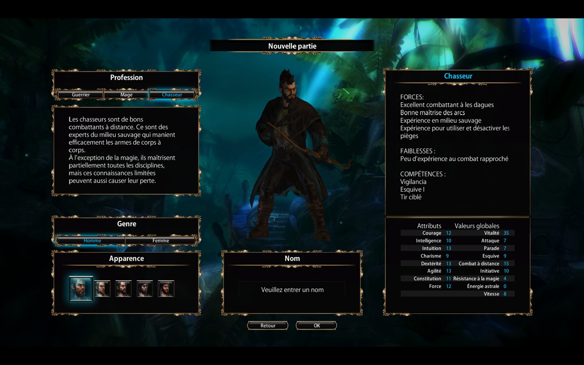 Pour le choix de la classe de votre personnage, vous êtes libre de choisir telle ou telle classe, mais je ne saurais trop vous conseiller de privilégier l’archer (le chasseur). Il tire de loin et est très efficace. De plus, dès le début, vous êtes accompagné d’un guerrier et d’un mage.