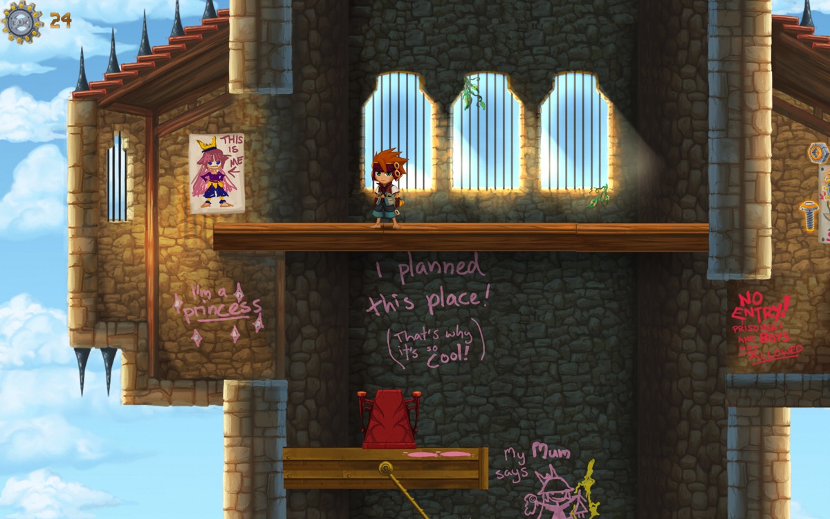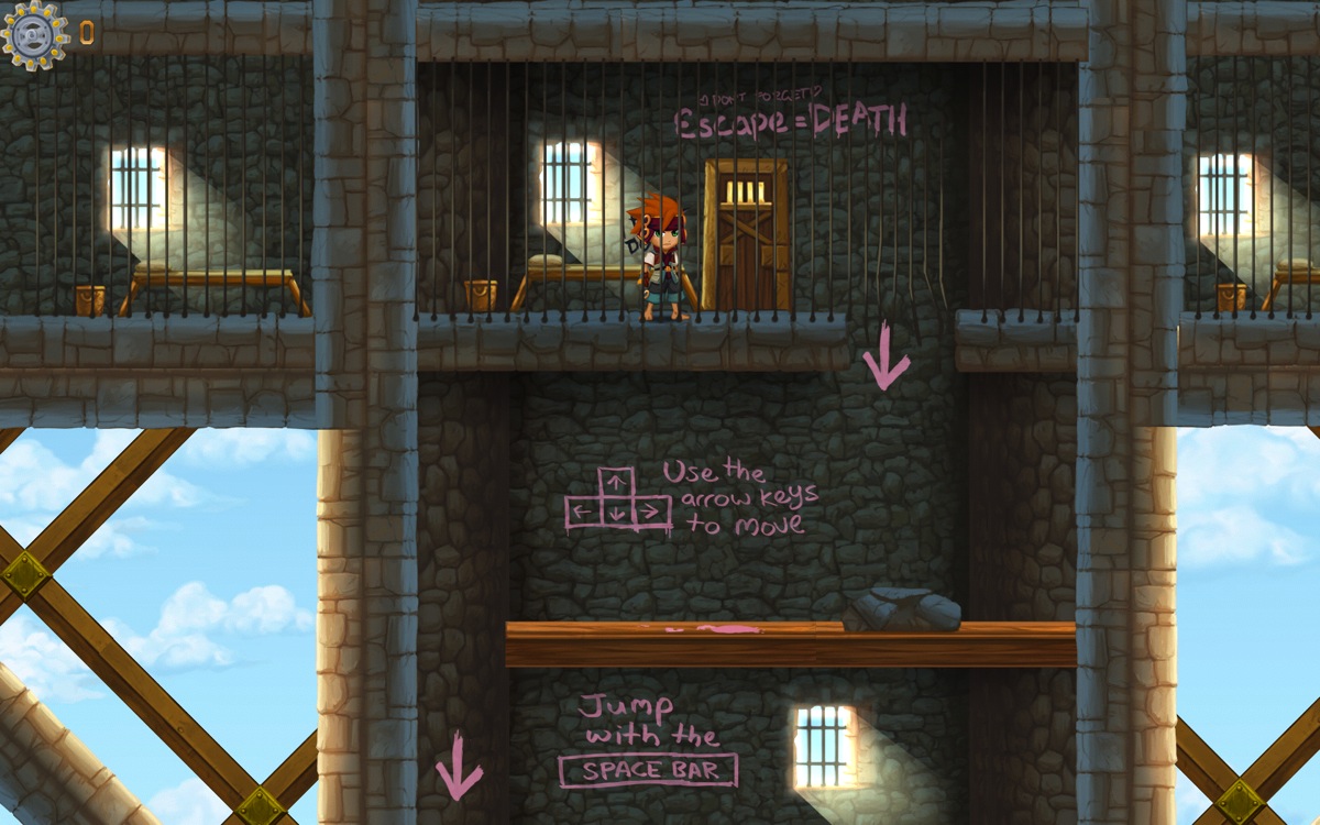 Pendant le sommeil du héros, la princesse est montée dans la prison. Pour je ne sais quelle raison, elle a décidé de l’aider à s’enfuir et tout au long du trajet qui mène vers la liberté, vous trouverez sur les murs des commentaires de la princesse, des pensées, des indices, tout ce qu’elle a envie d’exprimer.