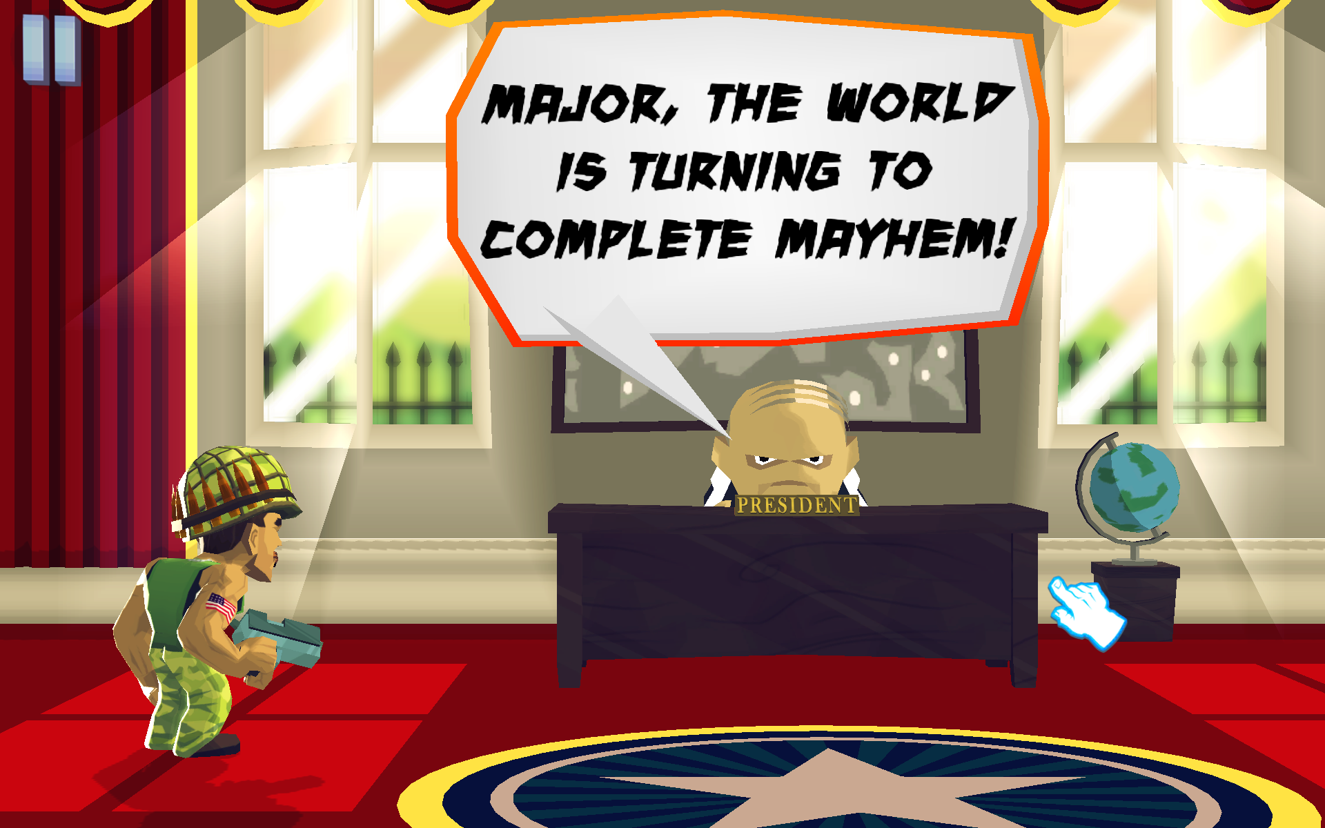 Major Mayhem est un vétéran américain. C’est un soldat qui est très médaillé pour ses actes de bravoures et à qui le gouvernement américain fait toujours appel quand il n’y a plus aucune autre solution. C’est le cas cette fois-ci. En plus, pour couronner le tout, votre copine (l’amour de votre vie) a été enlevée par les méchants, une raison de plus pour aller les combattre et les massacrer sans aucun remord.
