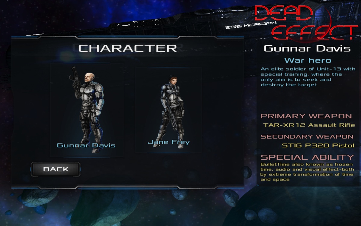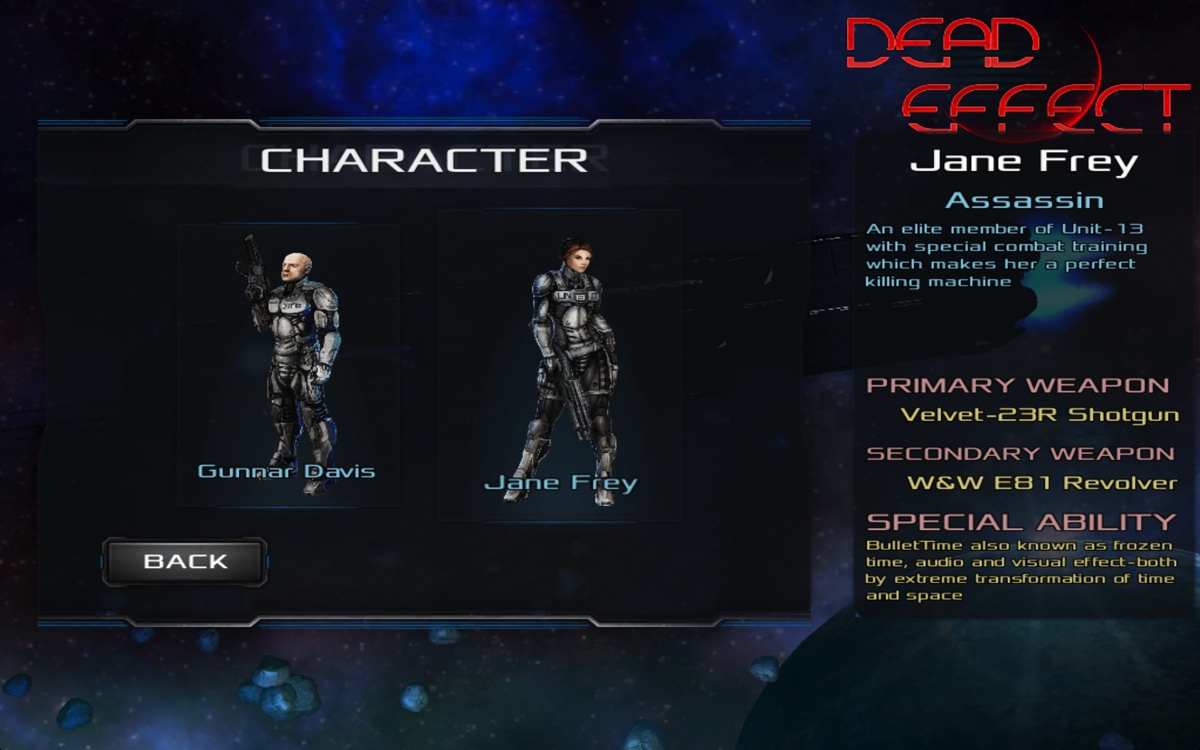Dead Effect raconte l’histoire de deux survivants Gunnar Davis, un héros de guerre membre de l’unité d’élite Unit-13 et Jane Frey, une assassin membre aussi de l’unité d’élite Unit-13.