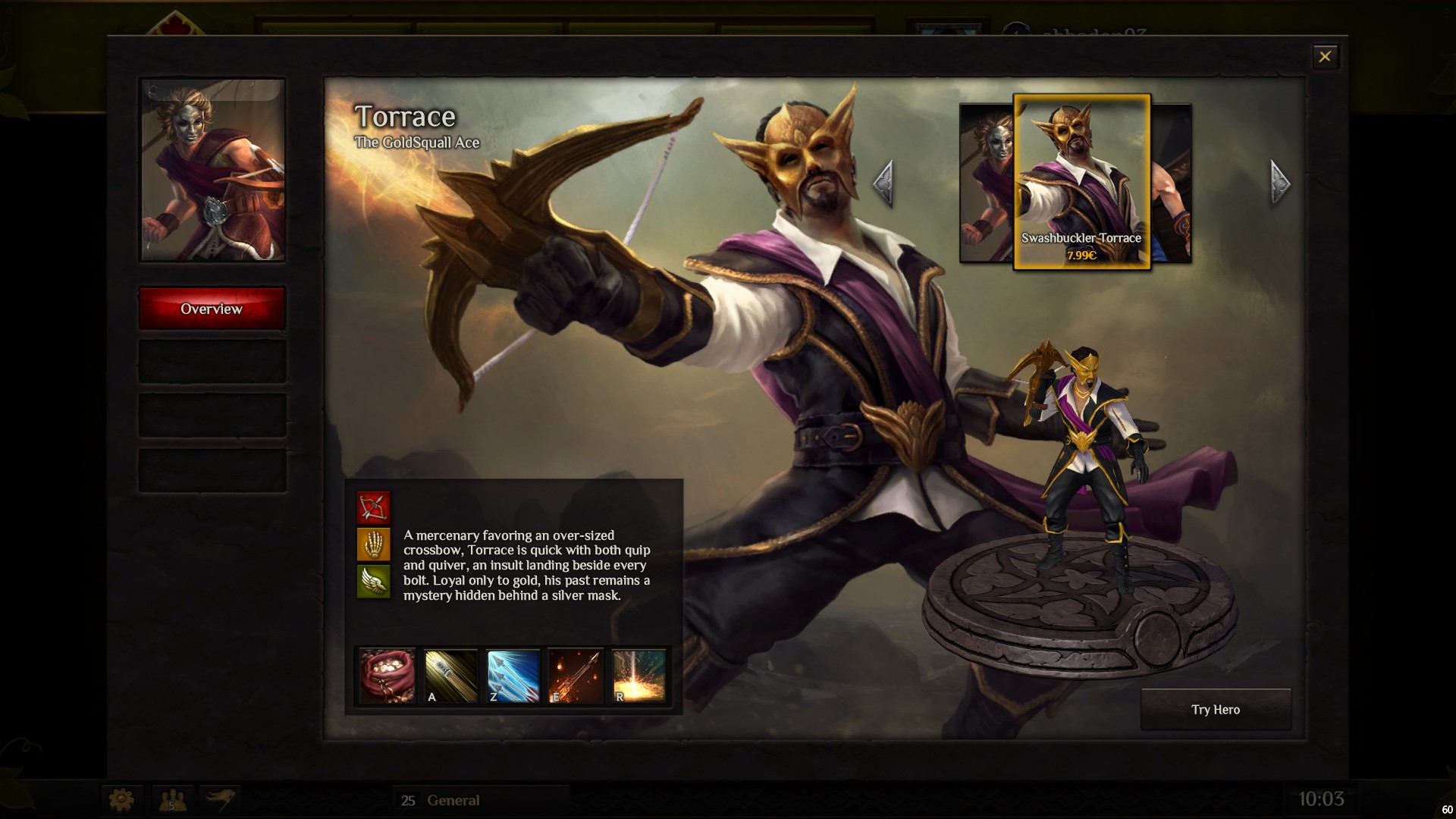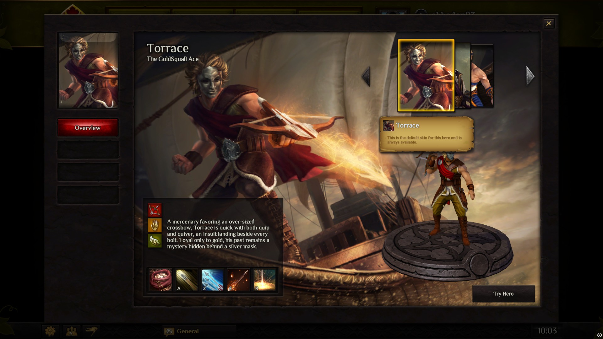 J’ai essayé plusieurs personnages et celui que je préfère, c’est Torrace. Parmi ses différents talents, celui que je trouve le plus efficace et que j’aime le mieux est le dernier : Bombardement (il permet de bombarder à distance les autres héros mais aussi les larbins (minions)).