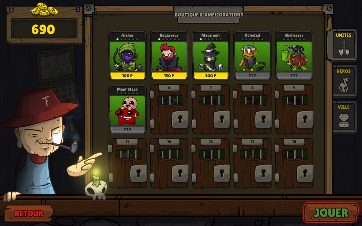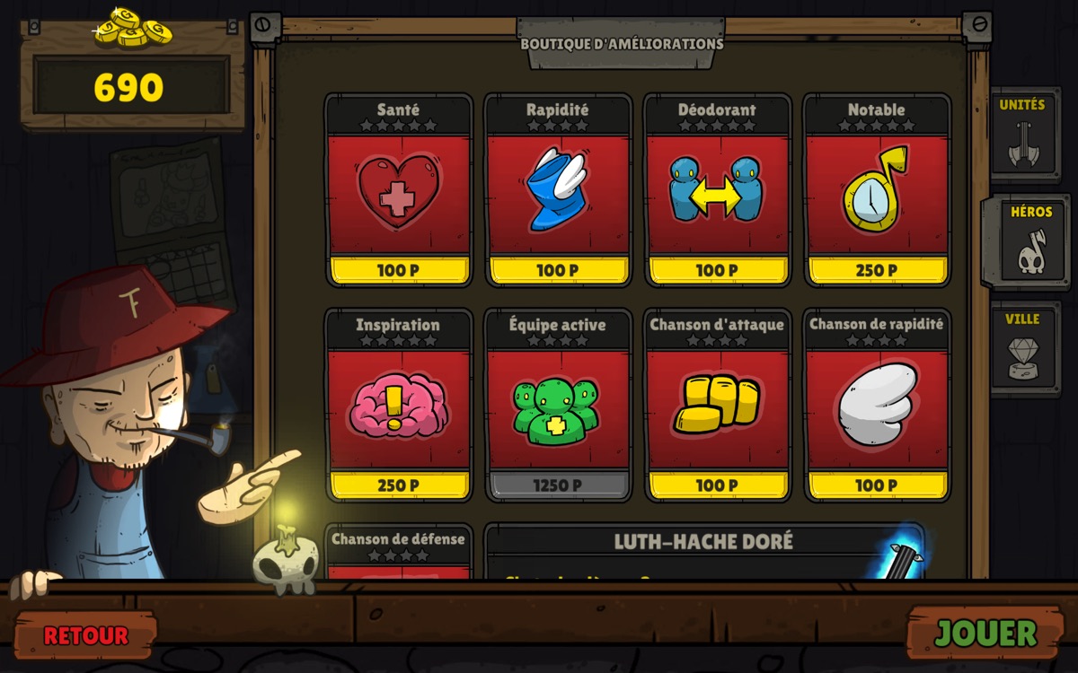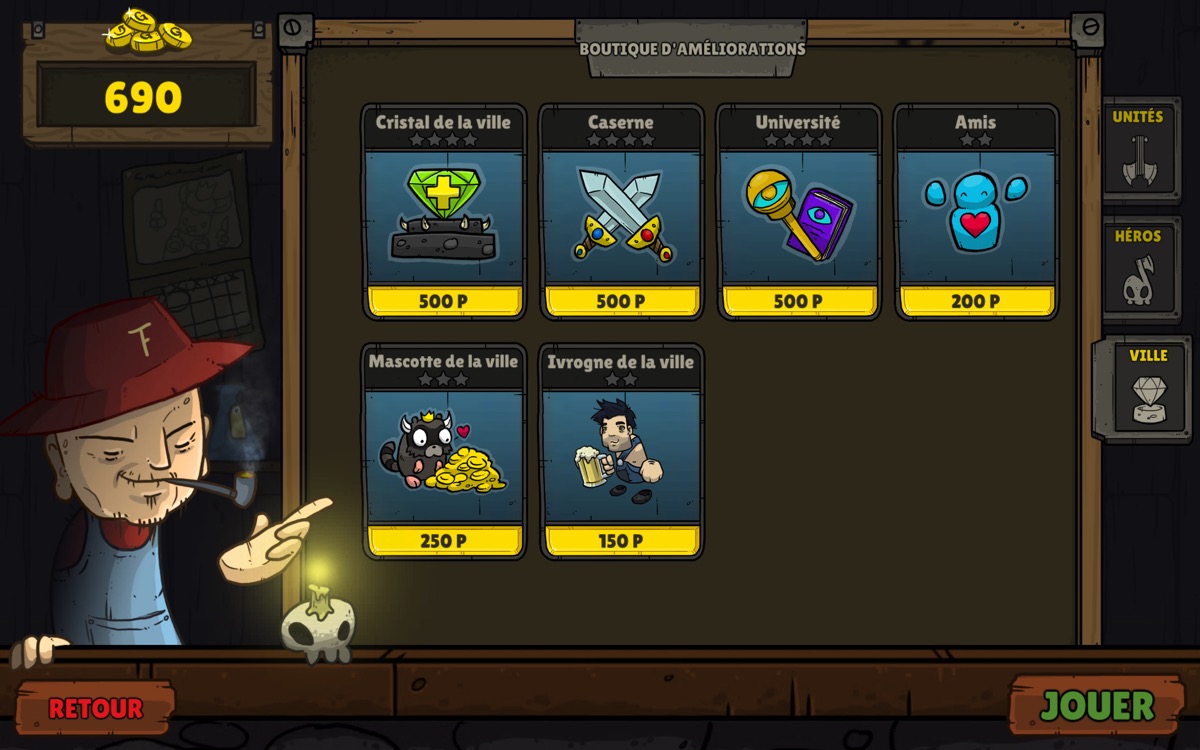 - le village – vous pouvez améliorer les points de vie du cristal, posséder la mascotte de la ville (qui va ramasser les pièces d’or pour vous), l’ivrogne (qui va vomir un peu partout et ralentit les adversaires), etc