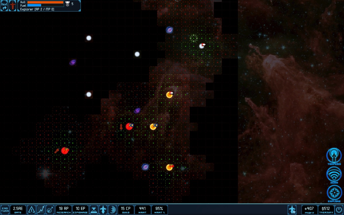 - avec votre vaisseau explorateur, la découverte de la zone spatiale où vous vous trouvez – quand vous découvrez un artéfact, votre explorateur l’étudie – vous pouvez gagner des informations, des technologies, une avancée dans vos constructions, etc