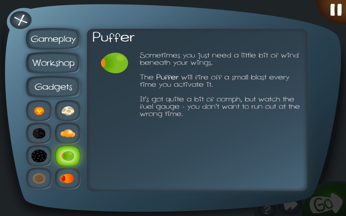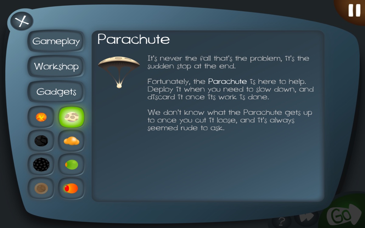 Certains des éléments qui vous sont proposés comme le réacteur, le parachute, les ballons, etc ont besoin que vous les activez pour fonctionner. Par exemple, pour le parachute, vous appuyez sur un bouton pour l’ouvrir et à nouveau pour vous en séparer, etc.
