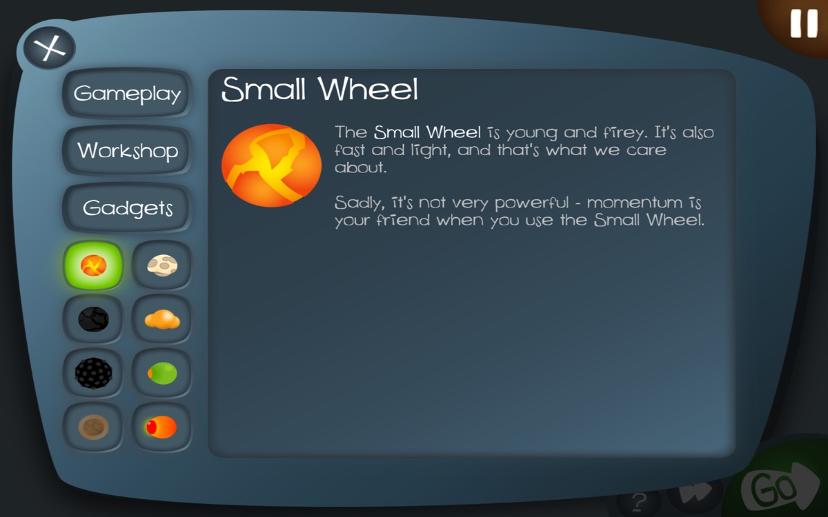 Pour le premier niveau, le jeu vous donne le plan. C’est un véhicule très simple. Il y a la boule de verre, quelques éléments intermédiaires et deux roues moyennes. Ces roues avancent toutes seules.