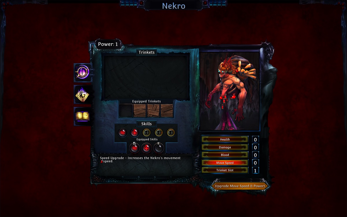 Tout d’abord, vous pourrez dispatcher vos points de pouvoir entre la santé, les dommages, le sang, la vitesse de déplacement et l’emplacement pour vos fétiches.