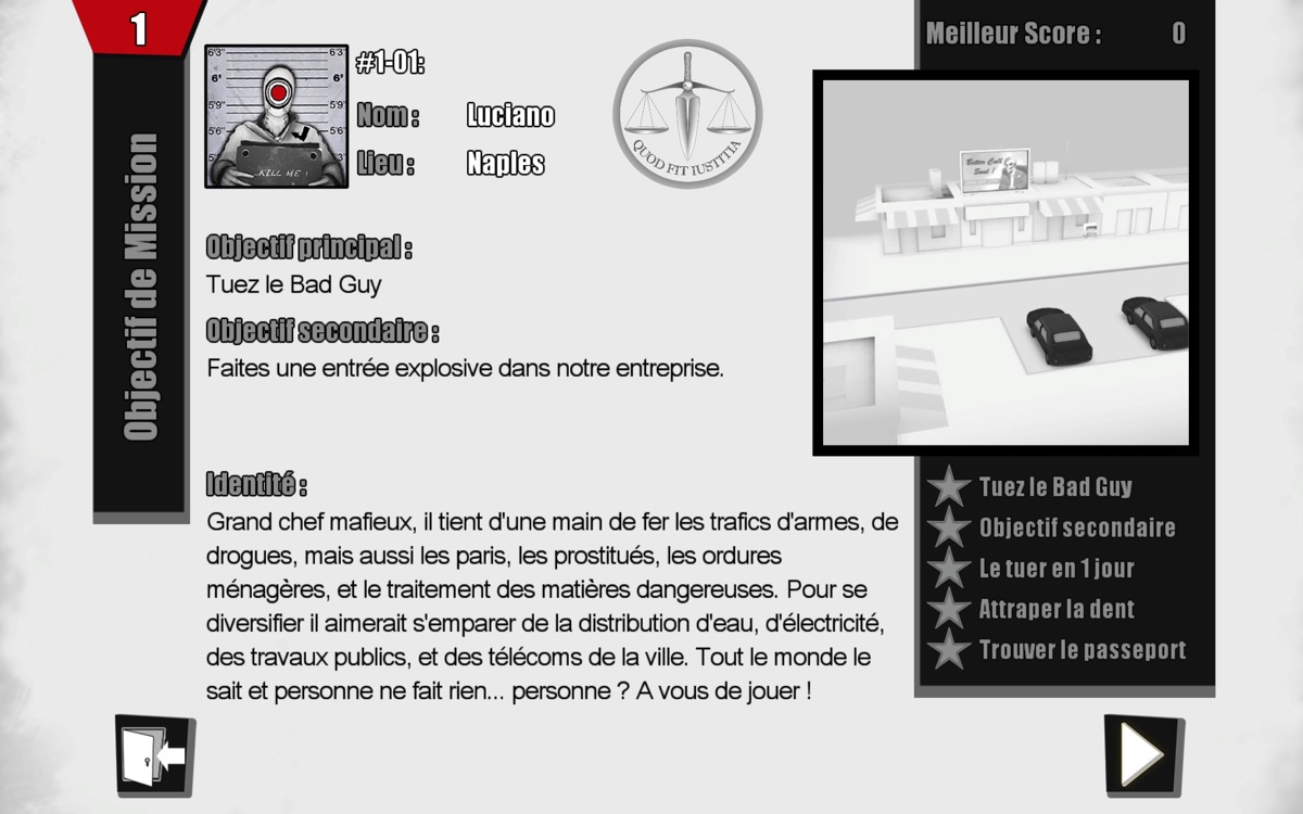 Le jeu comporte une soixantaine de missions. La première consiste à éliminer Luciano, il habite Naples et c’est un chef de la mafia italienne. Luciano fait sa promenade matinale. Les rues sont désertes. Vous devez saboter une voiture, la faire accélérer, lâcher le frein à main pour qu’elle fonce et écrase Luciano.