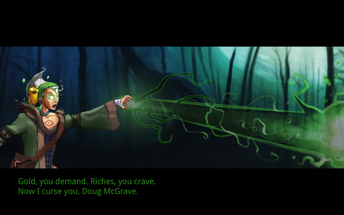 Un jour, une vieille dame lui demande de l’aide. Son petit village est la proie des démons et… ils sont pauvres comme tout. Evidemment, des pauvres, cela n’intéresse pas Doug McGrave et il continue son chemin, ignorant la vieille dame. Erreur ! Celle-ci est une magicienne et lui lance une malédiction. Tout l’équipement, toutes les connaissances, toutes les armes et protections de Doug McGrave disparaissent. Pire, il ne peut pas garder une arme plus de quelques minutes en main, elle disparaît alors.
