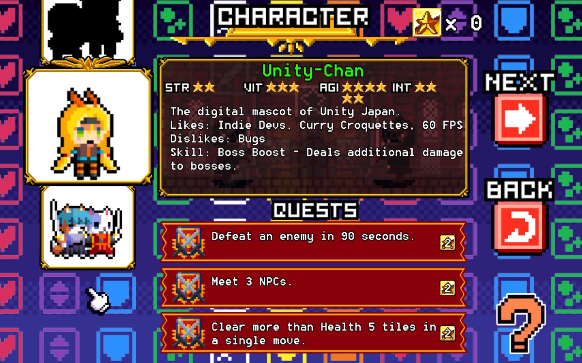 - Unity Chan : 2 de force, 3 de vitalité, 6 d’agilité, 2 d’intelligence et son talent est d’infliger plus de dégâts aux chefs