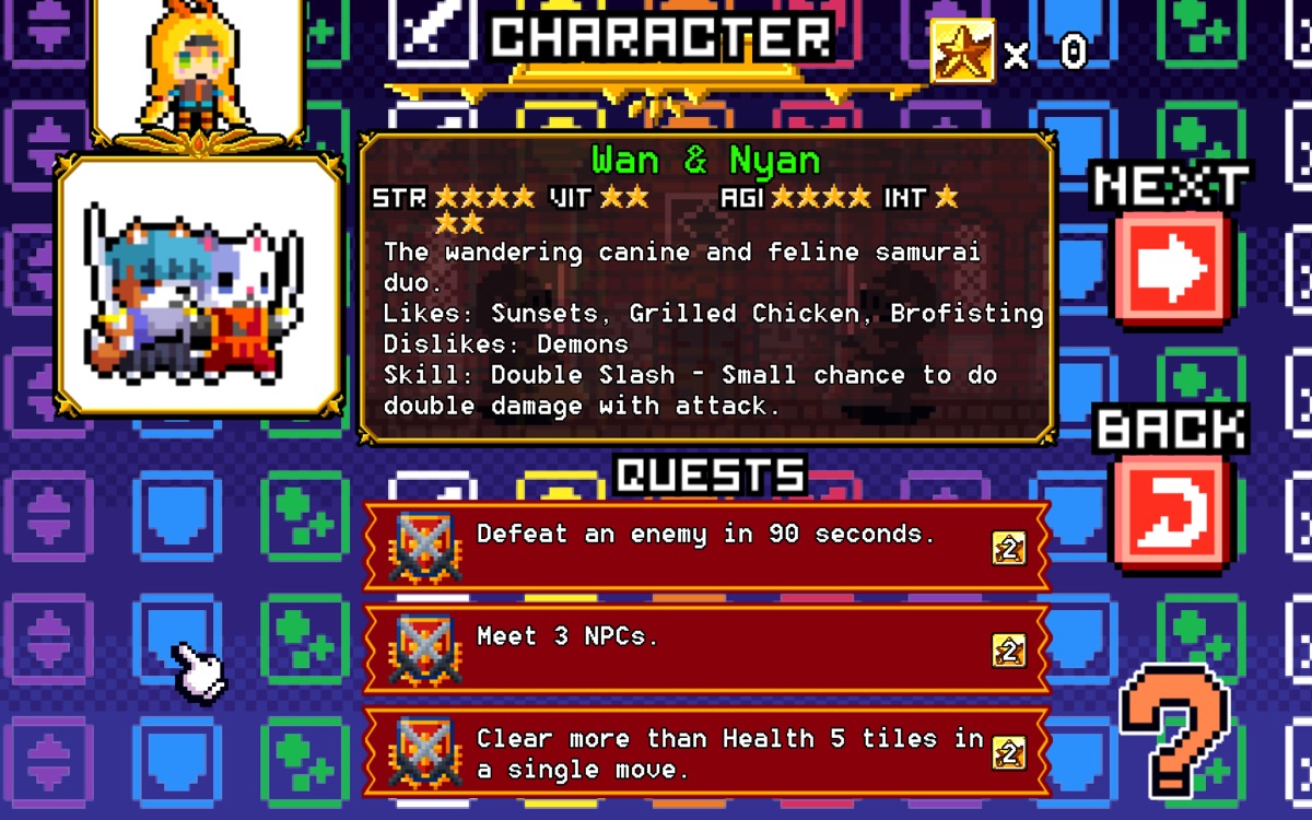 - Wan & Nyan (un duo de chien et chat) : 6 de force, 2 de vitalité, 4 d’agilité, 1 d’intelligence et comme talent la possibilité de doubler les dommages lors d’une attaque
