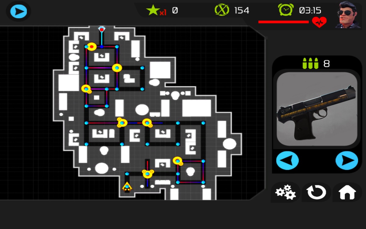 Pour chaque niveau, vous avez un plan. Vous définissez à tout moment vos ordres à travers ce plan. Vous décidez du chemin, vous pouvez aussi stopper l’agent Awesome et quand vous rencontrez un gardien, vous choisissez quelle arme vous voulez utiliser contre lui. Si vous arrivez par derrière, vous pouvez utiliser le cable pour étrangler le gardien.