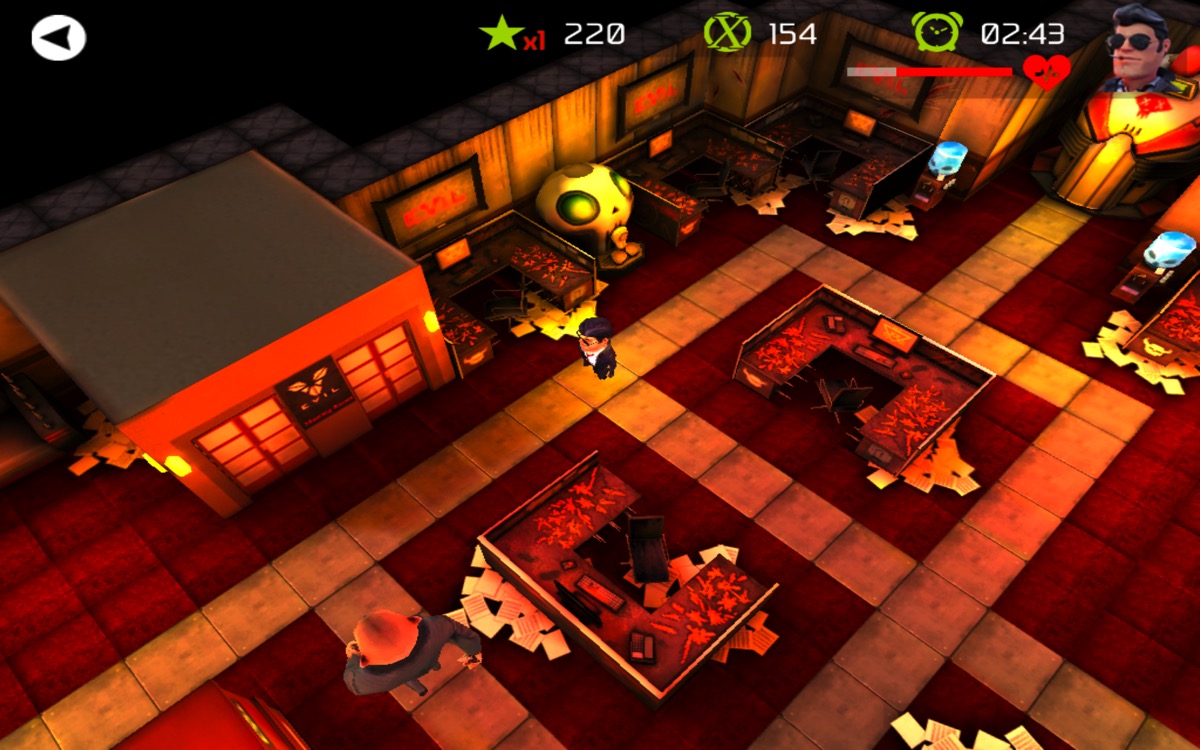Il doit aller dans les bureaux de son ancien employeur (E.V.I.L) et liquider les 12 personnes qui composent la direction. Pour cela, il va falloir repérer les déplacements des gardiens, les éviter (et plus souvent les éliminer) et progresser à travers les bureaux.