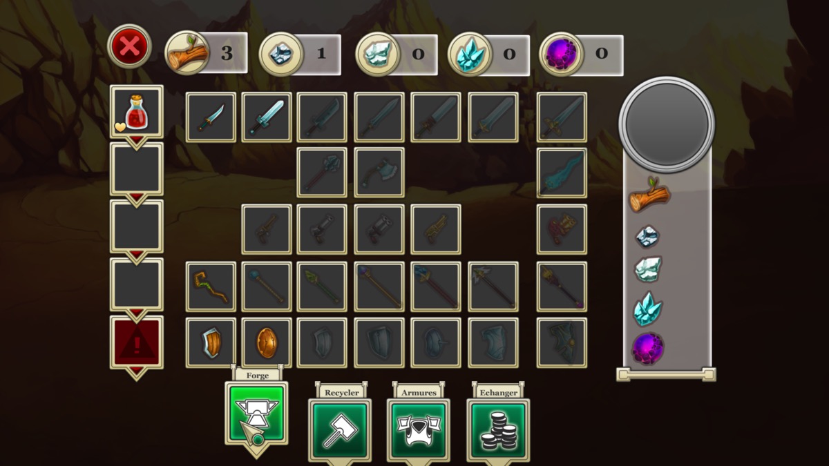 Entre chaque niveau, vous pouvez aller dans la forge pour recycler vos vieux équipements ou ceux que vous avez récupérer et que vous ne désirez pas utiliser et fabriquer de nouvelles armes ou armures.