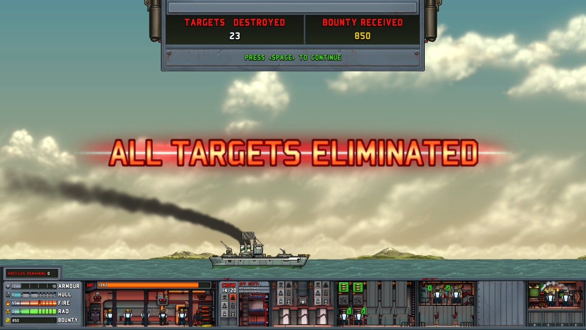 A force de se prendre des bombes, la structure de votre bateau souffre et baisse. Les ingénieurs et matelots dans la salle des machines travaillent pour réparer la structure de votre embarcation et la faire remonter. Il arrive que différents postes prennent feu. Formez un ou plusieurs matelots en pompier (fireman, en anglais) et disposez les aux endroits où il y a le feu.