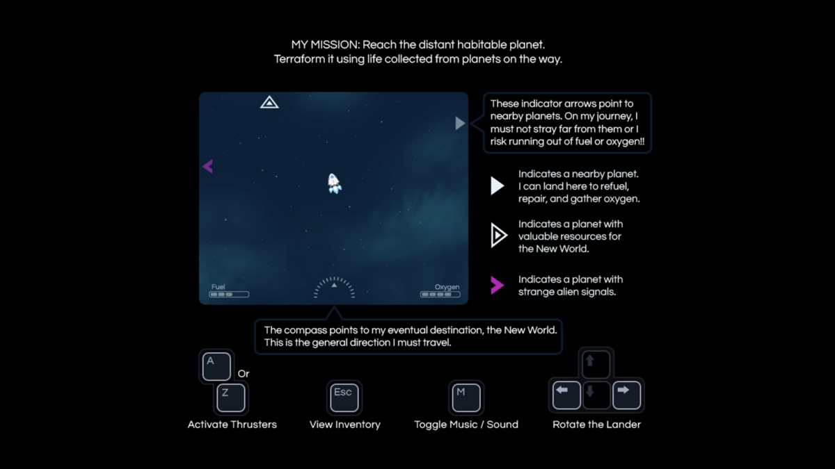 Il y a deux éléments auquel vous devez faire attention au niveau de votre vaisseau, ce sont l’oxygène et le fuel. Il est donc recommandé de faire des petits bonds et dès que vous voyez une planète, il faut atterrir dessus et faire le plein.