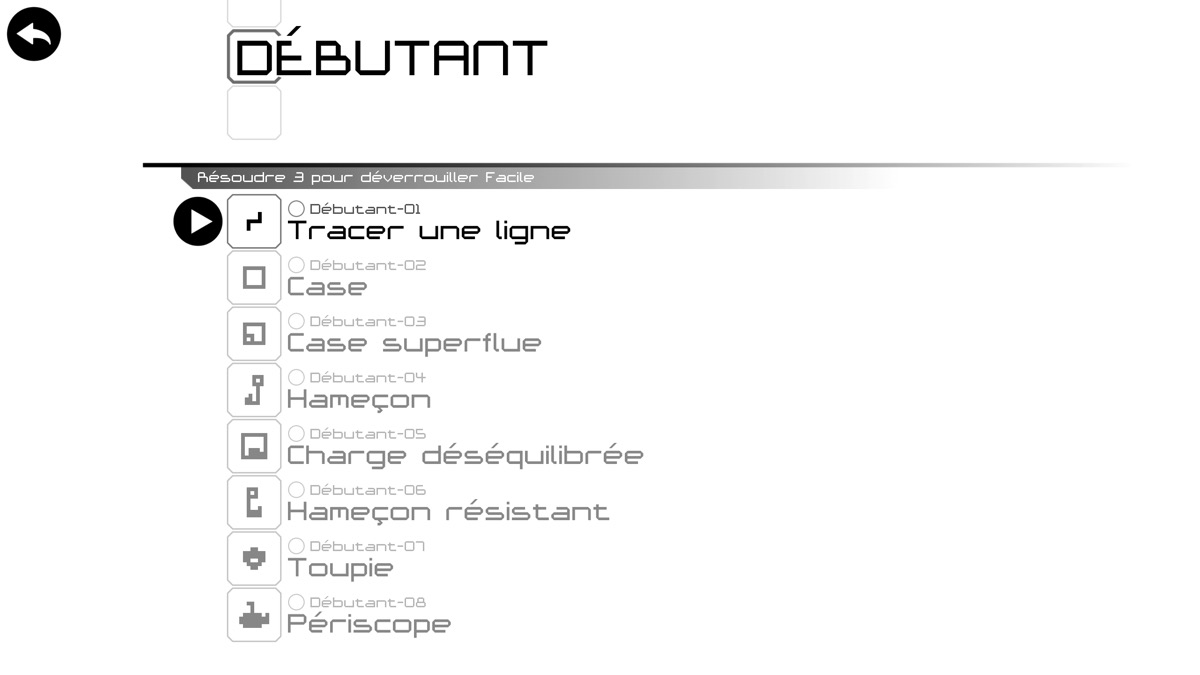 Le jeu est divisé en plusieurs niveaux de difficulté (débutant, facile, moyen et supérieur) et chaque niveau contient plusieurs tableaux. Vous pouvez découvrir dans la vidéo le niveau débutant correspondant au tutoriel et qui contient 10 tableaux et le niveau facile qui lui contient 25 tableaux.