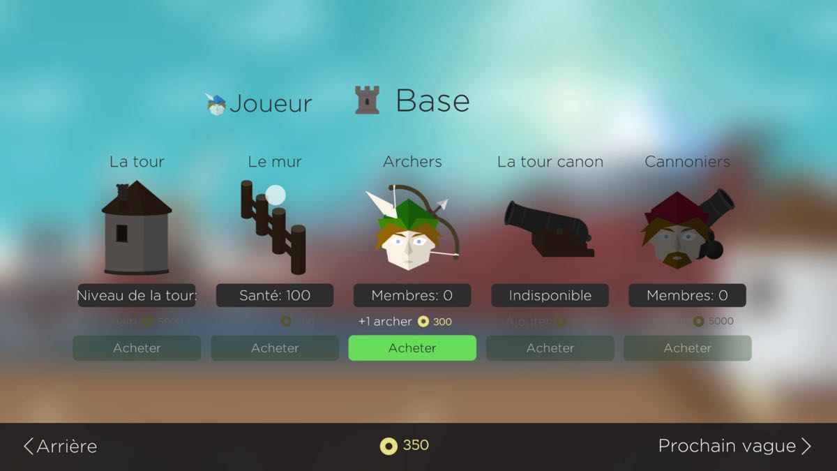 A chaque ennemi éliminé, vous gagnez des pièces d’or. Avec cet or, vous pouvez acquérir entre les niveaux de nouvelles compétences ou des améliorations. Par exemple, la première améliorations que vous allez surement acheter permet d’envoyer plusieurs flèches à la suite, c’est une sorte de chargeur. Il y a aussi de nouvelles armes, des défenseurs, une meilleure barrière, etc.