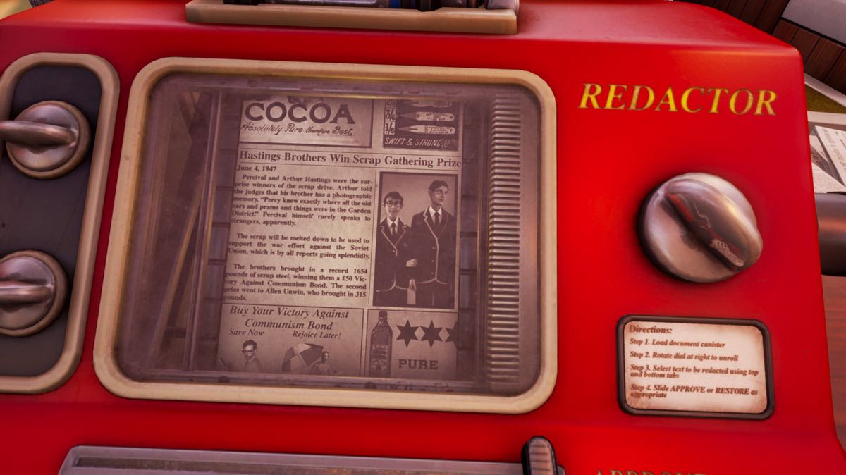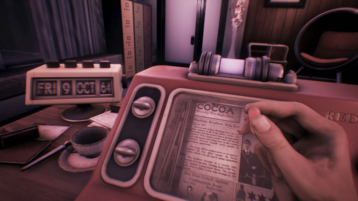 Un jour, au bureau, après avoir lu un article vous concernant (plus particulièrement un article sur vous et votre grand frère dans votre effort de guerre contre le communisme), vous vous êtes dit : STOP !. Vous avez refusé de prendre votre pilule de Joy et aussi étrange que cela puisse se passer, votre perception de la réalité a commencé à changer. Vous vous rendez compte que votre collègue, ce génial Clive, manigance pour prendre votre bureau, que l’on vous dénonce comme opposant sous prétexte que vous ne comprenez pas l’intérêt de censurer de vieux articles et surtout, surtout vous regardez les choses différemment.