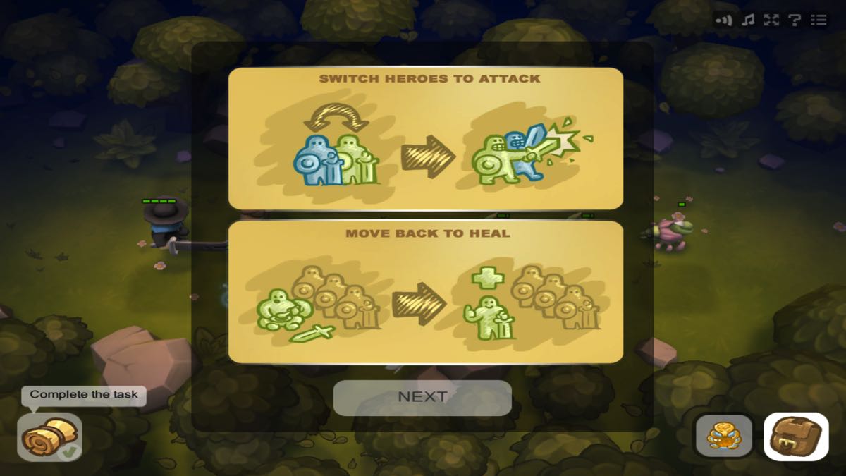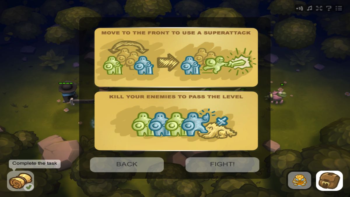 Vous commencez le jeu avec une patrouille de base composé d’un paysan, d’une archère, d’une prêtresse et d’un guerrier. Tous les personnages affrontent les ennemis se trouvant sur sa ligne. L’archère et la prêtresse combattent à distance alors que les deux autres au corps à corps. Chaque personnage a une attaque secondaire qu’il met en pratique en passant de l’arrière vers la ligne de front. Par exemple, l’attaque secondaire de l’archère est d’envoyer une flèche à tous les ennemis du terrain et pas uniquement ceux de sa ligne.