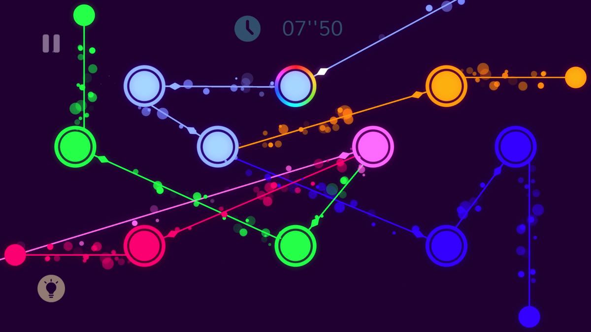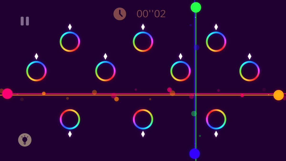 Votre objectif est de pointer le bon rayon de couleur vers le bon rond et ainsi l’activer. Vous savez qu’un rond reçoit la bonne couleur quand le cercle arc-en-ciel prend la couleur de l’intérieur du rond. Une fois qu’un rond est activé, vous pouvez pointer son rayon vers un autre rond pour l’activer à son tour.
