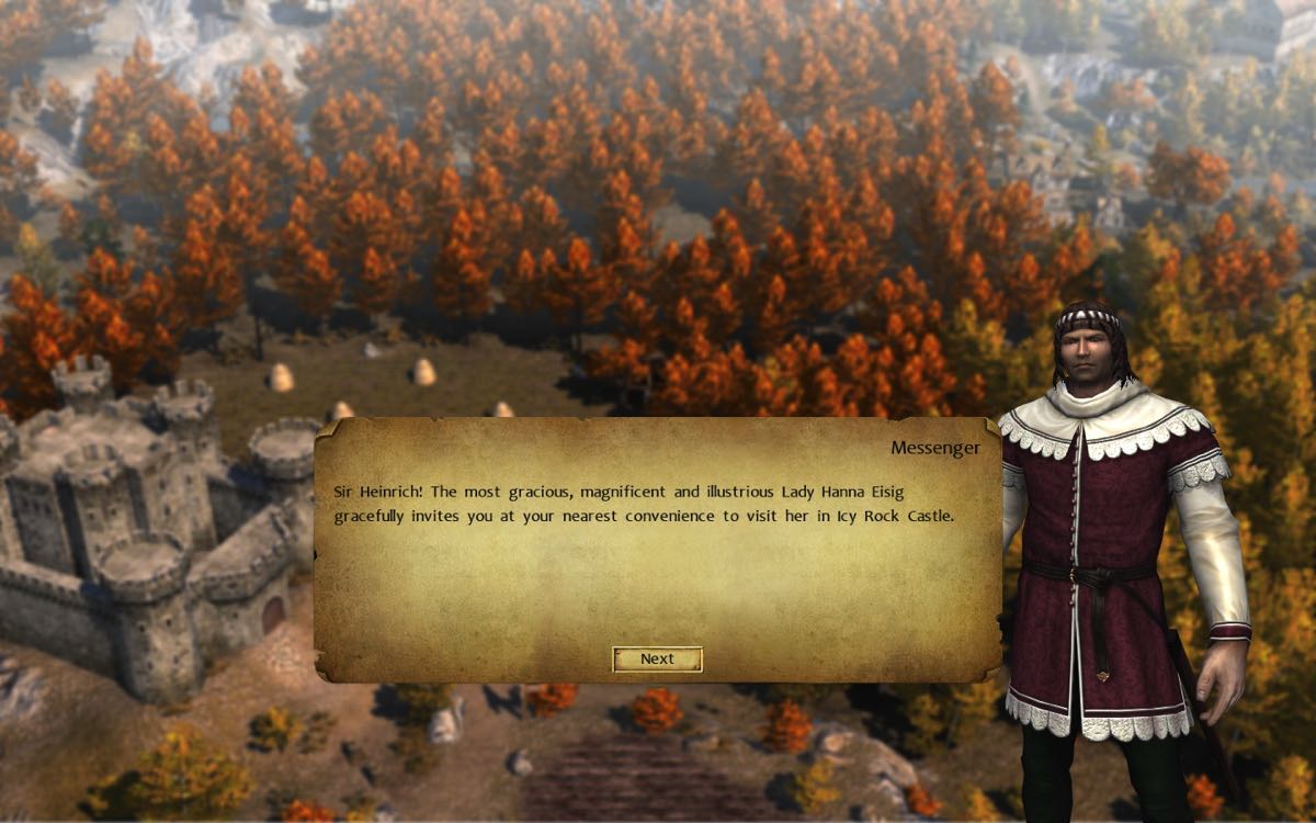 Ne rêvez pas, vous ne serez pas le troisième homme ! Eisenwald compte donc deux grands seigneurs et plusieurs chevaliers. Vous êtes un de ses chevaliers, pas le plus pauvre mais surement pas le plus riche. Vous avez un chateau et quelques fermes qui vous apportent des revenus hebdomadaires.