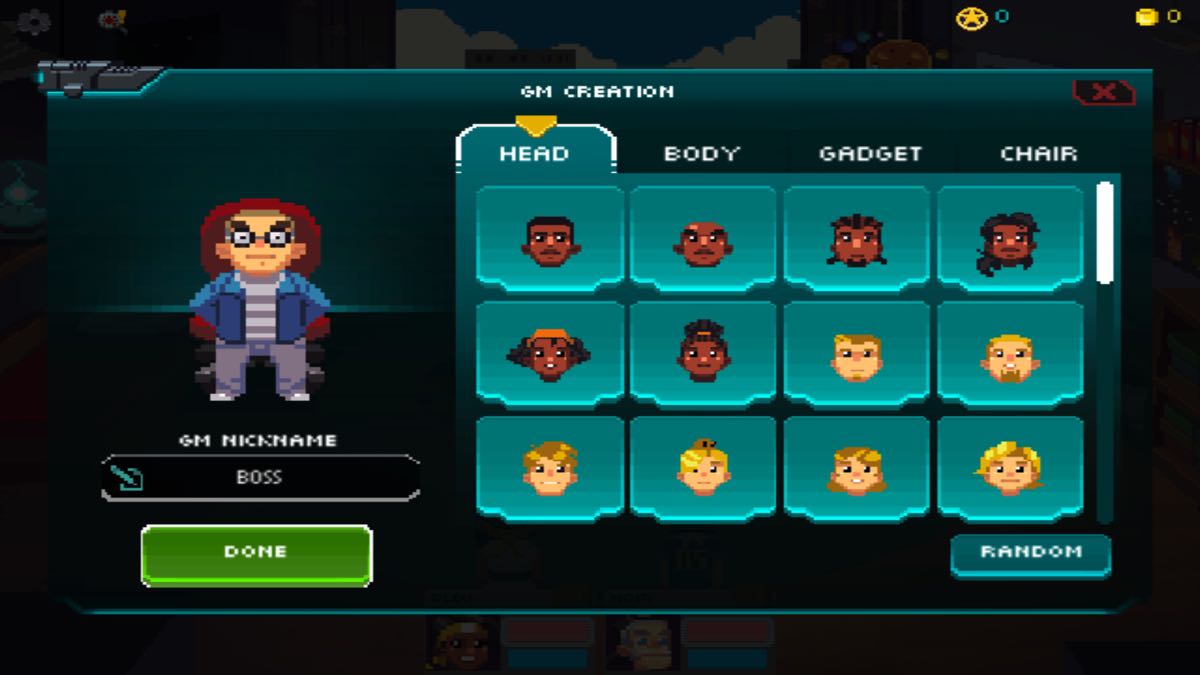 Le jeu commence avec la sélection de vos deux héros. Vous choisissez leur nom, leurs deux compétences passives et leur talent. Ensuite, vous créez votre Maître du Jeu (souvent appelé juste par ses initiales, MJ) avec de son côté, un choix porté sur son physique (tête, corps, gadget et son fauteuil).