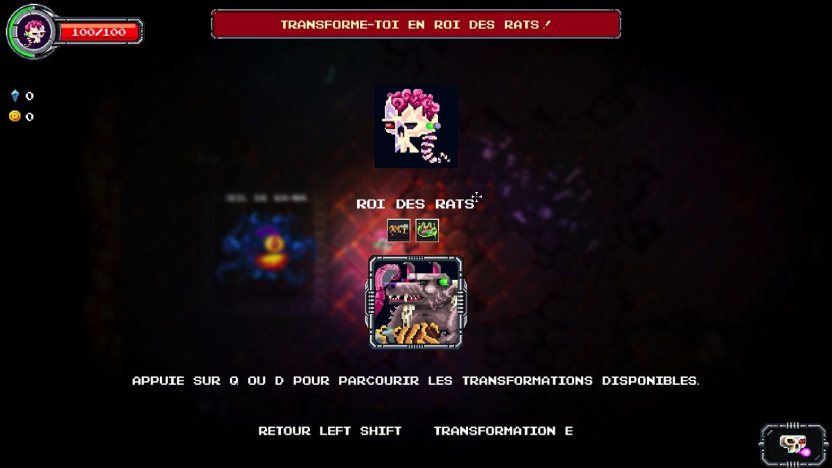 Plus vous avancerez dans les niveaux, plus vous remplirez les missions que vous donne votre mentor, plus vous aurez à votre disposition de nouvelles transformations. ATTENTION, si vous mourrez avec une transformation, celle-ci disparaît définitivement et vous vous retrouvez dans votre faible forme de grouillot.