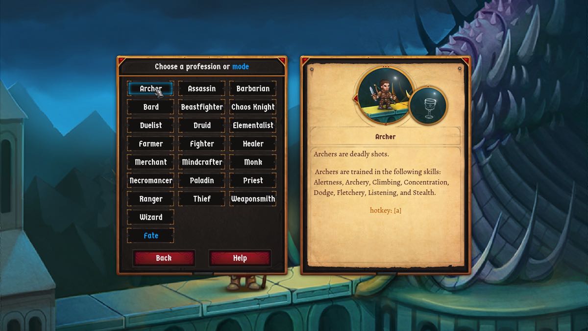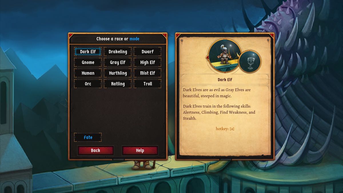 Si vous débutez le jeu avec le tutoriel, vous aurez pour seul choix le sexe (et bien sûr le nom) de votre personnage. Franchement, je vous conseille de jouer le tutoriel pour apprendre les bases des règles du jeu, une fois que vous êtes mort, passez au « standard mode » qui est le niveau débutant sans les éléments du tutoriel. Dans ce mode, vous pouvez créer votre personnage. Vous avez le choix du sexe, de la race (12 différentes comme les nains, les gnomes, les orcs, les elfes -noirs, gris, hauts et brouillards- etc) et enfin, la classe (guerrier, magicien, prêtre, voleur mais aussi nécromancien, chevalier du chaos, moine, fermier, forgeron, etc). Evidemment, chaque race et chaque classe a ses propres spécificités. Notez d’ailleurs qu’un homme est plus fort et qu’une femme est plus agile. Une fois que vous avez tout sélectionné, le jeu vous crée aléatoirement une histoire avec un passé et des motivations.