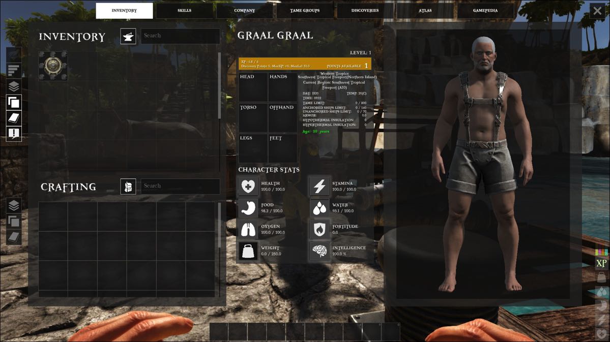 La première des choses à faire, c’est la création de votre personnage. Comme vous jouez à Atlas à la première personne, c’est surtout comment vous êtes perçu par les autres joueurs. Ce que j’ai apprécié, c’est la possibilité de vieillir votre personnage (pour le rajeunissement, c’est clairement limité). J’ai donc joué un homme d’une soixantaine d’années et ce qui est drôle, sur la fiche personnage dans le jeu, il est écrit qu’il a 20 ans !!!
