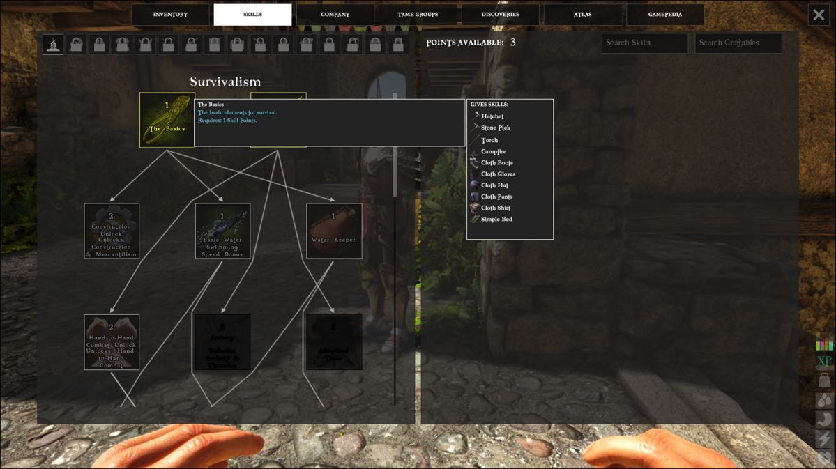 Au début du jeu, vous avez un point de compétence à dépenser et ensuite trois points dans les talents. Evidemment, je vous conseille (mais c’est tellement logique) de mettre dans les talents un point dans « les bases » ce qui vous permettra de construire des vêtements, une arme, un outil, une torche, un feu de camps et un lit (comme vous vous en doutez, si vous avez avec vous les ressources) !