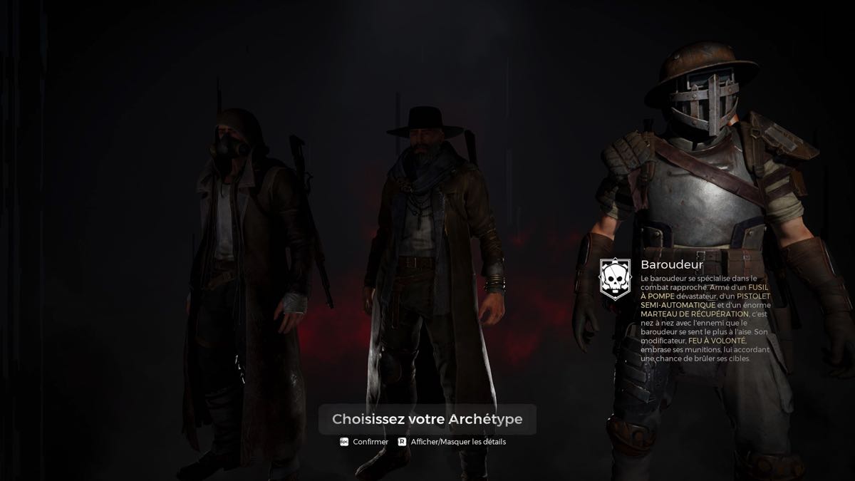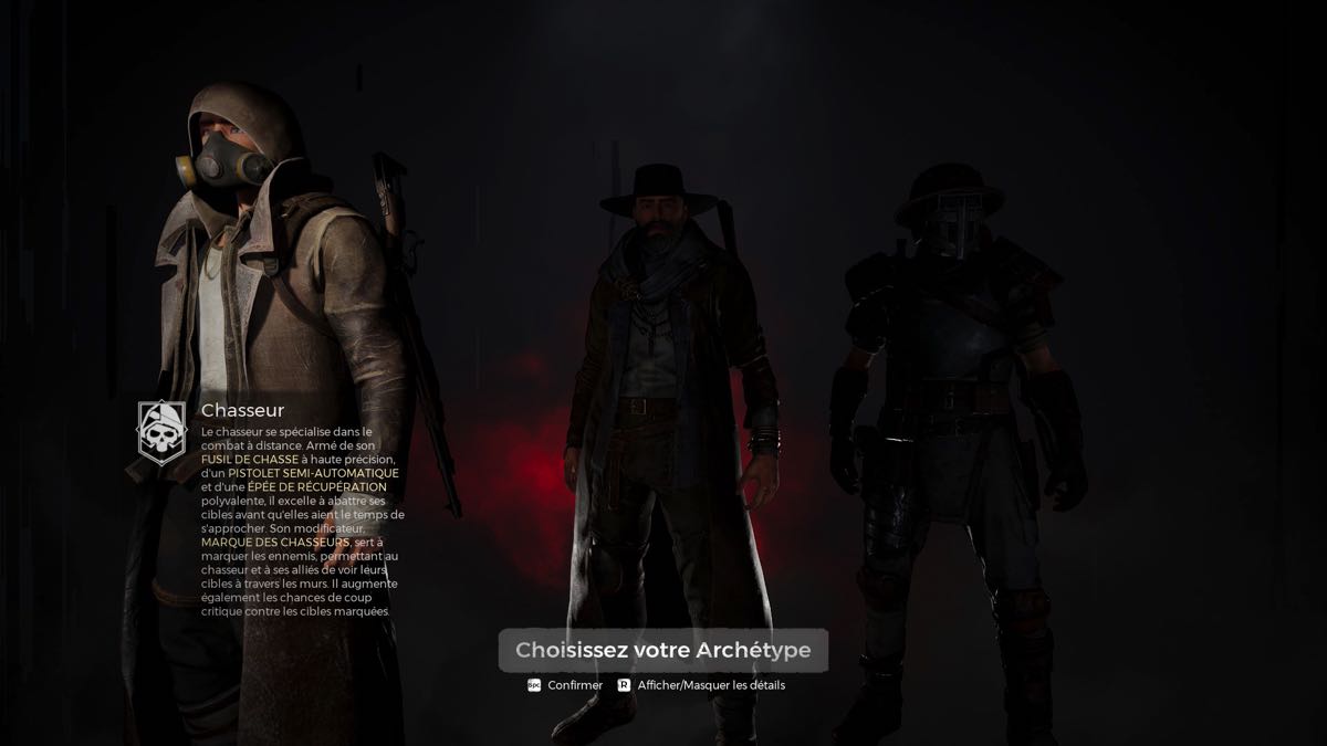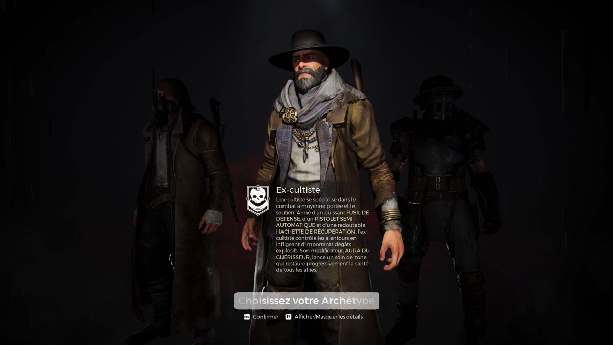 Donc, comme survivant, vous devez choisir votre voie : chasseur (combats à distance), ex-cultiste (combat à moyenne portée et soutien) ou baroudeur (combat rapproché).